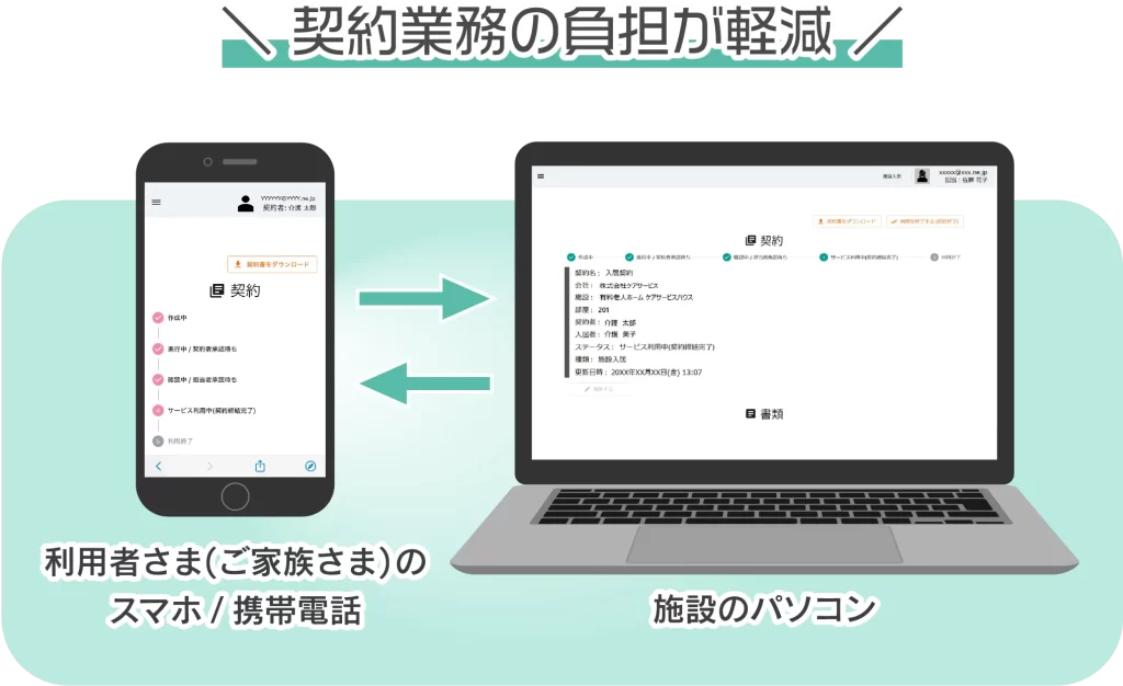 KAIGO CLOUDが契約業務を電子化することで、プリントや郵送手配は不要になり、お客さまごとに異なる進捗や契約書が簡単にデータで管理できます。
